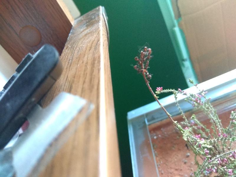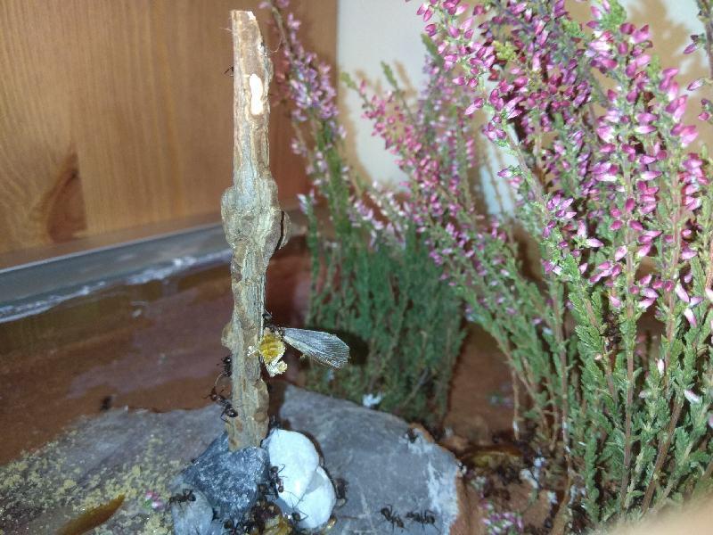 W między czasie kolonia odnotowała dwie próby ucieczki... Pierwsza gdy wypchnęły watę zatykającą jedno z wejść do gniazda. Na szczęscie szybko to zauważylem i skończyło się tylko na ucieczce jakiejś setki robotnic, które biegały w okolicach gniazda. Druga próba była zaraz po odnowieniu bariery olejowej. Podczas smarowania musiałem przekręcić arenę aby dostać się do kawałka rantu. Następnie odwróciłem arenę spowrotem jednak nie zauważyłem, że postawiłem ją dwa cm dalej... To wystarczyło mrówkom. Spostrzegły, że jak wejdą na najwyższy pęd wrzosu to sięgną półki nad nimi. Tutaj też szybko zareagowalem i skończyło się na kilkudziesięciu robotnicach.