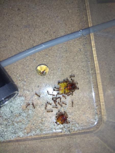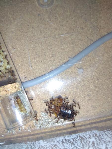 Dzięki temu kolonia jest długo wieczna (tak długo aż hodowca nie popełni jakiegoś poważnego błędu). Mrówki wygrałem w licytacji na jednej z grup na Facebooku. Była to jedna Q + 10w i 10 poczwarek. Przy takich gatunkach zalecane jest branie przynajmniej 2Q (a najlepiej 4) aby nie było tak, że kolonia straci wszytskie królowe zanim nastąpi pierwsza rójka. Ja zaryzykowałem gdyż hodowca od którego je kupowałem nie dysponował większą ilością Q. Mrówki szły do mnie dosyć długo. Przypomnę, że był to listopad a temperatury były wtedy w okolicach 10°C. Mimo to, że mrówki sa ciepłolubne i szły bez heat-packa to doszły całe i zdrowe a ponad to Q złożyła pakiet jaj w podróży. Kolonia dostała nową probówkę z dwiema przegrodami korkowymi oraz arenę i kroplę miodu. Nie było chętnych na miód (a przynajmniej wtedy gdy patrzyłem). Następnego dnia dostały kawałek karaczana tureckiego. Zaobserwowałem kilka robotnic, które coś tam poskubały. Miód raczej omijały ale jedna robotnica się skusiła: