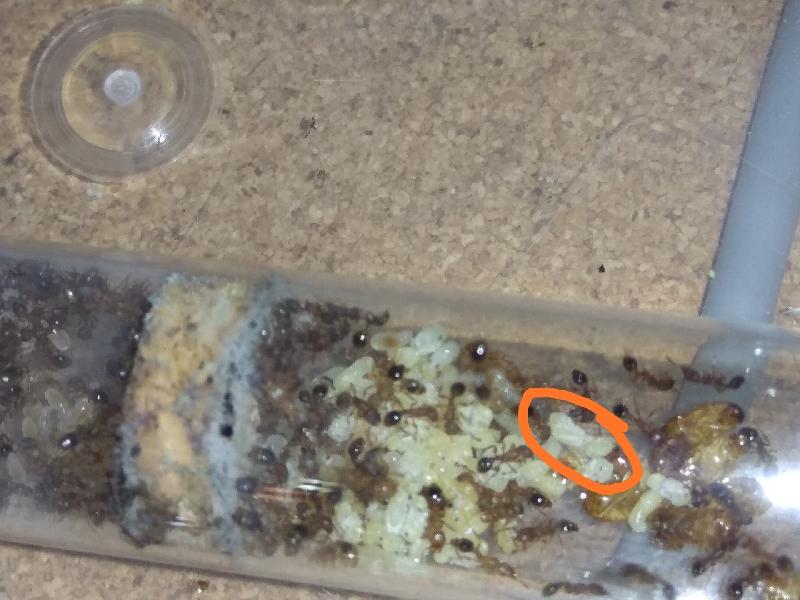 Na zdjęciu robotnica sama wciąga dwie sztuki wylęgu karaczana tureckiego (znacznie przekraczające jej wagę) na szczy probówki. W takim tempie niedługo będę musiał przejść na dorosłe karaczany. Kolonia w dalszym ciągu zawiera 3Q. Ilość poromstwa to kolejny znak, że prawdopodobnie wszystkie 3Q są zaplemnione.