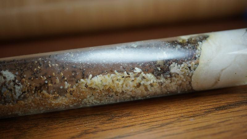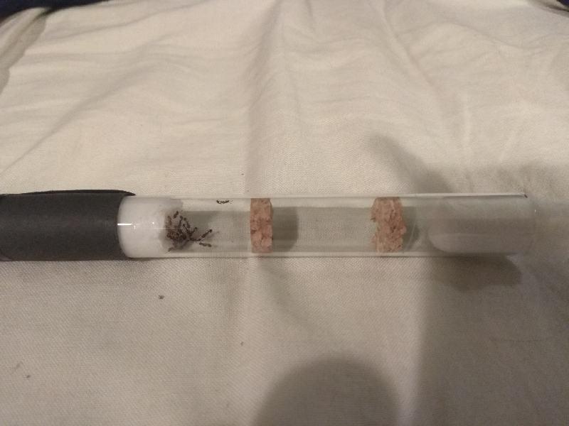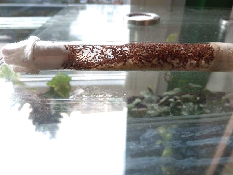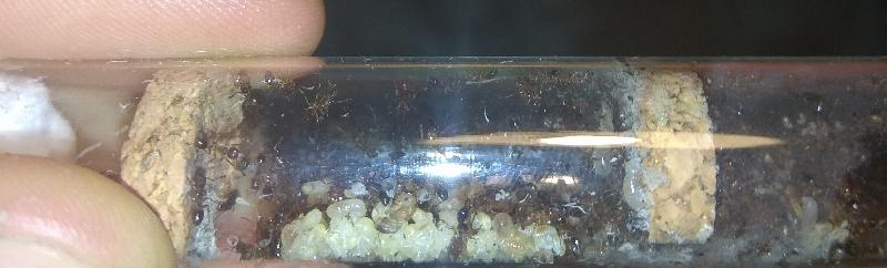 W między czasie podjąłem decyzję o sprzedaży kolonii ze względu na to, że istnieje ryzyko iż będę się przeprowadzał do lokum, w którym nie miałbym możliwości trzymania takich dużych kolonii jakie tworzą T. bicarinatum. Kupiec znalazł się bardzo szybko i dwa dni temu kolonia została wysłana (dziś dostałem informację, że mrówki dotarły całe i zdrowe). Świadomie zostawiłem sobie wspomniane wcześniej formy płciowe z myślą, że jeśli mi się poszczęści to będę miał świeże Q i będę mógł zacząć hodowlę kolonii od nowa. Przez ostatnie 4 miesiące bardzo polubiłem ten gatunek i chętnie bym go dalej hodował dlatego bardzo liczyłem, że eksperyment zakończy się sukcesem. Natomiast dzisiaj gdy sprzątałem starą arenę po mojej kolonii (gdzie nadal zostało kilka robotnic, których nie dałem rady spakować), pod kawałkiem korka spotkałem Q bez skrzydeł. Co ciekawe jest to prawdopodobnie Q która przyszła do mnie jako pierwsza (jedna z trzech założycielek mojej kolonii). Poznałem ją bo jest zdecydowanie mniejsza od pozostałych Q. Oczywiście dostała nową probówkę i robotnice, które wyłapałem z areny. Bacznie będę obserwował ich rozwój jak i probówki eksperymentalnej.