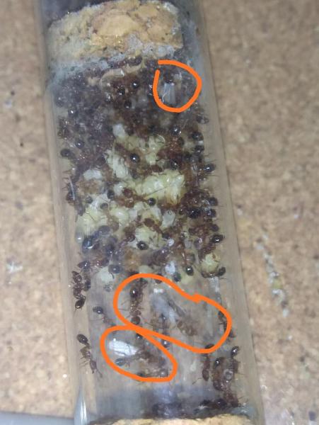 Nic ciekawego się nie działo aż do 24.02 kiedy to znalazłem na arenie dogorywającego samca. To mogło oznaczać, że w kolonii pojawiła się nowa zaplemniona Q. Robotnic dalej przybywało w oczach podobnie jak z formami płciowymi. W ramach eksperymentu wyciągnąłem kilka skrzydlatych Q i samców i odseparowałem je do oddzielnej probówki licząc, że dojdzie do zaplemnienia i powstaną nowe zaplemnione Q. Od tamtego czasu nie wiele się zmieniło ale dalej czekam.