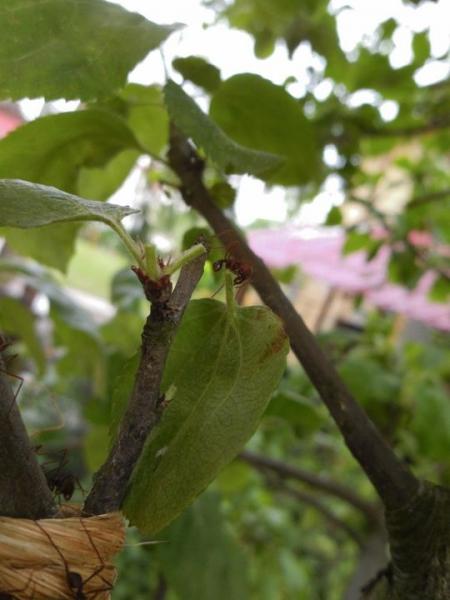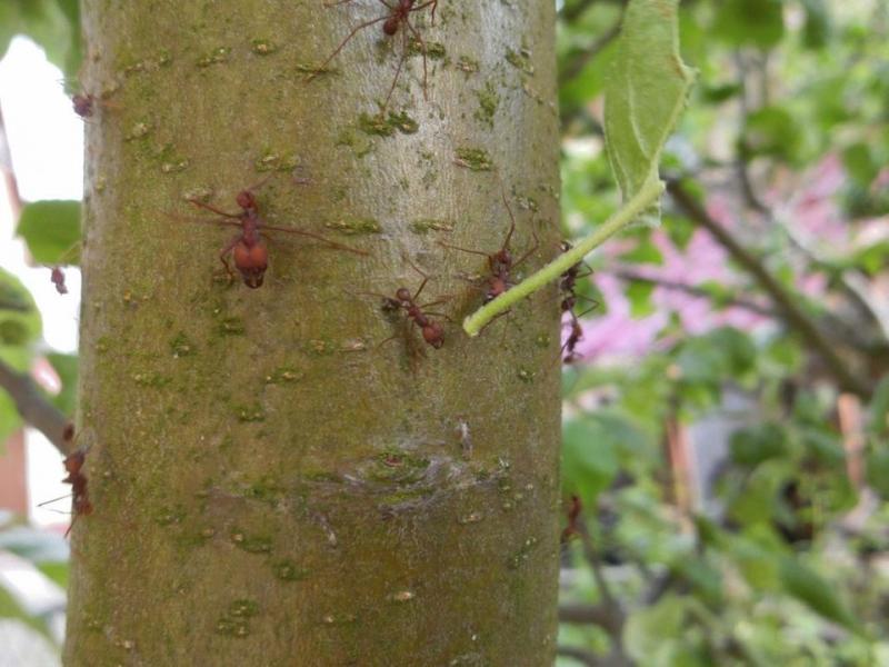 Jako że formikarium znajduje sie w pomieszczeniu na pierwszym piętrze, musiałem zastanowić się nad drogą ku wolności. Wybór padł na jabłoń, którą mam za oknem dosłownie na wyciągnięcie ręki. Kolejnym jej plusem był fakt, że odwiedza ją licznie (agresywny) Lasius cf. niger oraz (oportunistyczna) Formica fusca/lemani, najpewniej w związku z mszycami. Wcześniej jeszcze upewniłem się, czy Atta są zainteresowane liśćmi tego drzewa. Okazało się, że tak. Wniosek w mojej wyobraźni nasuwał się sam: Atta chce zdobyć liście, a Lasius broni szlaków i skupisk mszyc. Podłączenie formikarium do drzewa miałem już wcześniej zaplanowane. Odbyło się to przez kilkumetrowy wąż, który z jednej strony podpiąłem pod arenę, a drugą końcówkę przymocowałem do gałęzi jabłoni na wysokości ~180 cm. No i wędrówka się rozpoczęła. Trochę jednak martwiłem się, czy na taką trasę wystarczy mrówek w kolonii, bo w końcu odległość była niemała. Moje obawy szybko zostały rozwiane. Maszerujących robotnic Atta były niewyobrażalne ilości... Na początku, po wyjściu z wężyka, mrówki bez większego zorganizowania zaczęły spacerować w dwóch kierunkach: w górę i dół jabłoni. Nawet gdy któreś z nich coś niosły, to i tak nie za bardzo wiedziały, gdzie się z tym kierować, więc najczęściej szły na sam szczyt drzewa, a później wracały w dół. Z biegiem czasu problem jednak rozwiązały i cały transport kierował się do wężyka. Zbierały najróżniejsze szczątki roślin, kawałki źdźbeł traw, opadłe płatki kwiatów jabłoni, itd. Ścinały też liście, ale akurat nie na jakąś wielką skalę. Choć stojąc pod jabłonią niekiedy można było poczuć się jak jesienią. Wcześniej bałem się też o fakt, że ścinające liście robotnice będą spadać razem z nimi i trafiać gdzieś dalej, gdzie nie odnajdą drogi powrotnej. Atta jednak było tyle, że szybko zajęły pole o powierzchni wielu metrów. Pojedyncze robotnice można był z czasem znaleźć nawet 15 m od jabłoni.