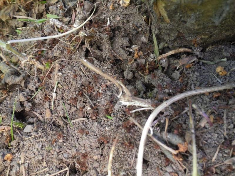 Drugiego dnia zauważyłem, że na jabłoń nie wchodzą już ani Lasius, ani Formica. Początkowo myślałem, że może o porę dnia chodzi. Później odłączyłem wąż od formikarium, wracające nim robotnice wrzucałem na arenę, a gdy ruch praktycznie się zastopował, to odpiąłem wąż też i od drzewa. Wykorzystałem fakt, że przyszła ulewa i większość renegatek, które nie chciały wrócić wężykiem, skupiła się na pniu, więc łatwiej było zbierać je do pojemnika. W kolejnych dniach kontynuowałem odzyskiwanie populacji. Uznałem wtedy eksperyment za zakończony. Chciałem się jednak jeszcze dowiedzieć, dlaczego rodzime mrówki przestały odwiedzać jabłoń. Wcześniej, zanim jeszcze wyzbierałem odciętą już część robotnic Atta, to przyjrzałem się podstawie pnia drzewa. Po ulewie i odłączeniu węża, mrówki licznie tam przesiadywały. Jakaś ich część spacerowała też w górę, a inne przeczesywały teren dookoła. Ale już nic nie zbierały. Utrata kontaktu z gniazdem i zapewne zmyte szlaki zapachowe zrobiły swoje. Okazało się, że Lasius ma tam gniazdo z otworami wyjściowymi dookoła pnia. Wniosek nasunął się taki: furażerujących, a teraz już raczej wegetujących, Atta zgromadziło się tam tyle, że podziałało to jak niezamierzony pasywny atak i Lasius bał się wyjść. Mrówki tworzyły kordon wokół pnia jabłoni, więc też i Formica nie miała jak przebiec, gdyż unikała kontaktu z obcymi robotnicami. Kolejnego dnia, kiedy było tam jeszcze trochę niedobitków Atta, to zauważyłem, że niektóre z ich robotnic jakby czuwają nad otworami gniazda Lasius, a niekiedy nawet któraś stara sie głębiej zapuścić. Trudno jednak powiedzieć, czy było to rzeczywiście zamierzone straszenie. Jak rozgrzebywałem lekko te otwory, żeby zmusić Lasius do reakcji, to tylko się chował głębiej, a jak jakaś jego robotnica trafiła na powierzchnię, to grzybiarki nie reagowały praktycznie wcale. Same już wyglądały na zmęczone i wiele z nich stało w takim bezruchu w różnych miejscach. Dopiero rankiem następnego dnia Lasius zdecydował się wyjść na powierzchnię gniazda. Zobaczyłem wtedy, że wegetujące tam do tej pory resztki robotnic Atta leżą martwe. Najprawdopodobniej doszło do jednostronnego ataku, gdzie Lasius bronił gniazda, a grzybiarki nie reagowały. Z całą pewnością wcześniej robotnice Atta również padały ofiarą ataków, kiedy znajdowały się na terenie gniazda Lasius. Alternatywna teoria jest taka, że Atta po prostu zdechły z powodu złych warunków. Z moich obserwacji wynika, ze robotnice pozostawione na zewnątrz zdychają w ciągu kilkudziesięciu godzin.