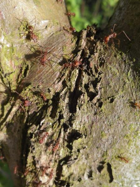 Ciekawe były też reakcje Formica fusca/lemani, kiedy natrafiały na przedstawicielki mojej kolonii. Przeważnie, jak to mają z w zwyczaju, starały się wszystkich omijać, ale gdy poczuły się osaczone, to przybierały groźną pozę z wysoko uniesionym odwłokiem i straszyły Atta, a nawet potrafiły złapać na sekundę za nogę. Miałem wrażenie, że reagują agresywniej niż Lasius. Nawet poza drzewem, już na ziemi, zdarzały się takie akty. Podobnie, jak w przypadku kontaktu z Lasius, mrówki parasolowe nie odpowiadały wtedy agresją. Niespodziewanym agresorem okazały się... Myrmica. Fakt, że przeważnie w obrębie gniazd, ale atakowały wtedy zaciekle. Za pierwszym razem zaobserwowałem to, gdy nadepnąłem na ich gniazdo w trawie. Na udeptanym miejscu zaraz pojawiło się ich wiele i zaczęły walczyć z przebywającymi tam nieznanymi sobie robotnicami mrówek parasolowych. Pomyślałem wtedy, że atakują dlatego, bo naruszone zostało ich gniazdo. Jednak w innym miejscu, inna kolonia też nie była obojętna na obecność grzybiarek i wdawały się w otwarty konflikt już bez mojej niezamierzonej ingerencji. Jednak w stosunku do Myrmica sp. Atta były nastawione bardziej bojowo. Odpowiadały żuwaczkami. Jeśli udało się im dobrze trafić, to z Myrmica niewiele zostawało. Jednak Atta nie były stroną atakującą w tych sporach, która chce za wszelką cenę pozbyć się konkurencji, dlatego też nie dochodziło do walk na dużą skalę.