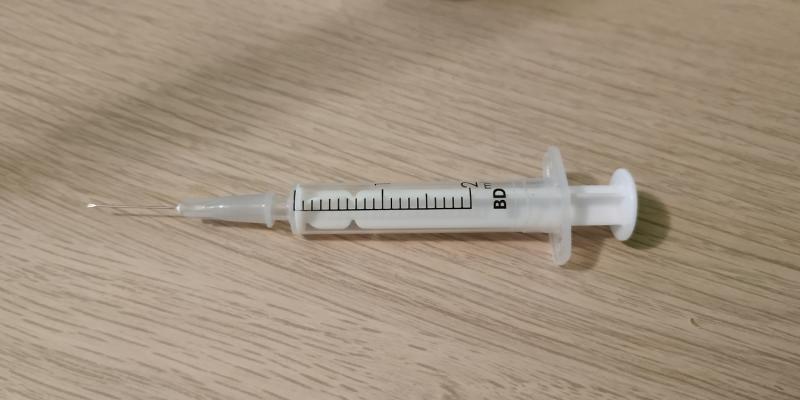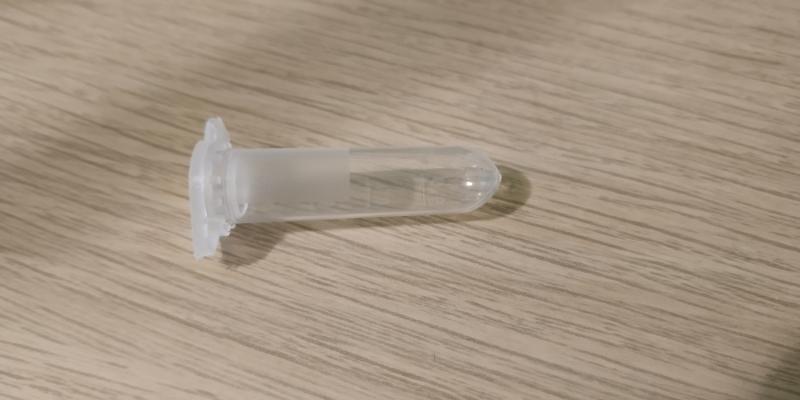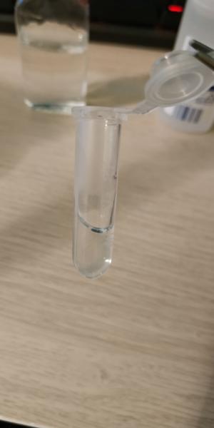 Teraz za pomocą igły nałożonej na strzykawkę ułożyłem okaz do konkretnej pozycji na samym środku eppendorfa. Po tym zabiegu również za pomocą igły nałożonej na strzykawkę odessałem wszystkie pęcherzyki powietrza, które utworzyły się podczas nalewania żelu. Tutaj również niestety nie posiadam do tego kroku zdjęć.