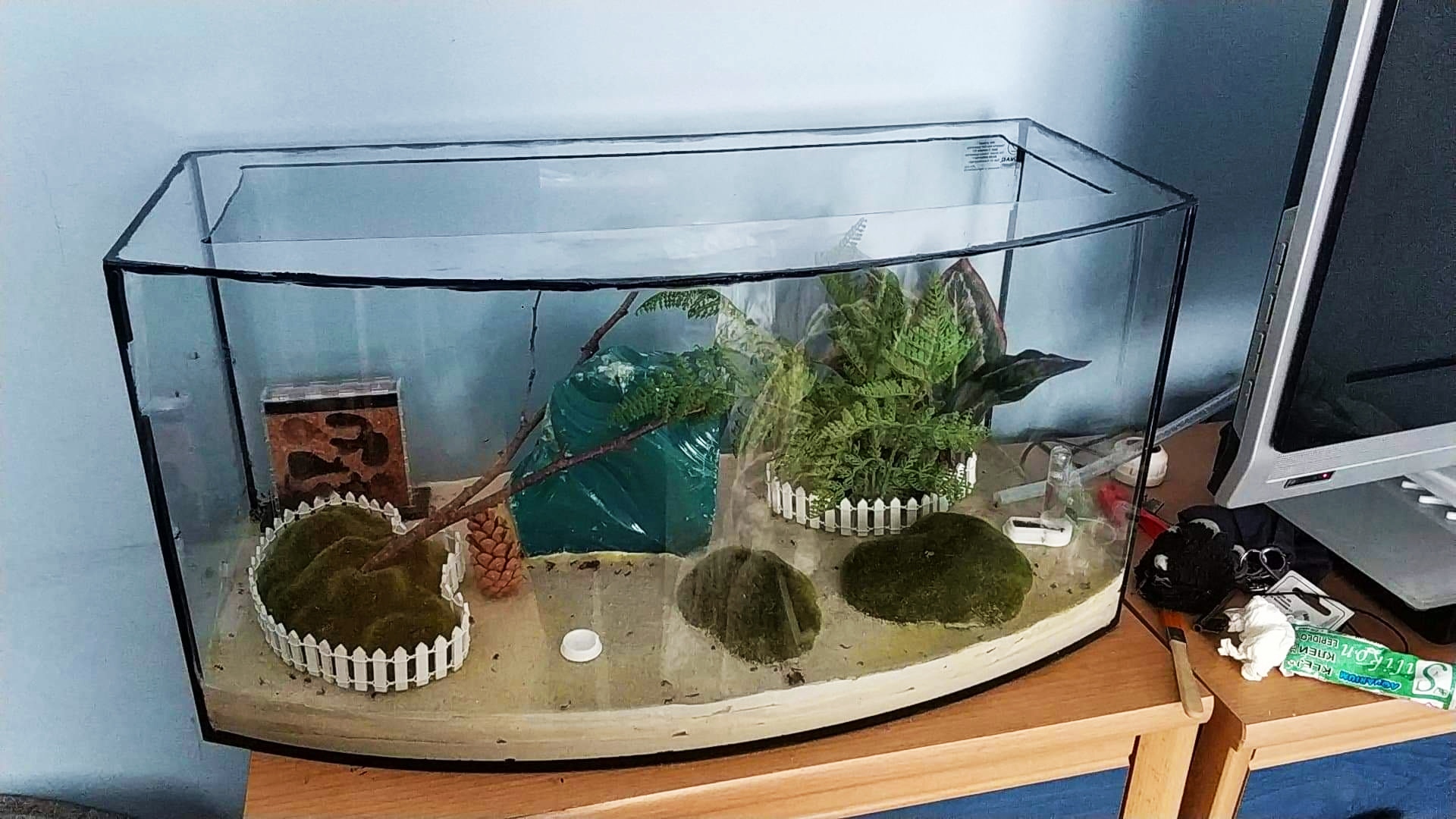 Pewnego dnia schodząc do piwnicy zauważyłem, że stoi tam stare, lekko porysowane akwarium po rybkach, które idealnie nadawałoby się na arenę dla moich C. nicobarensis.