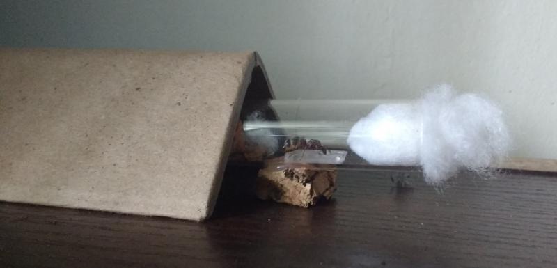tego samego dnia umieściłem ją w kroku pierwszym. Przegroda z kory dębu korkowego. Zaciemniam kawałkiem kartonu. Talerzyk wykonany z pleksy na którym podaje rozwodniony miód lipowy.
