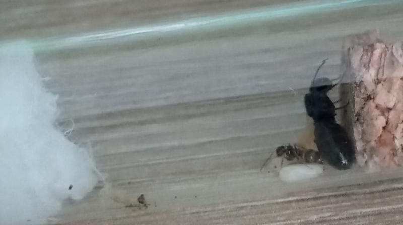 Zimowanie zakończyło się zgodnie z terminem, mróki ani myślały o dalszym rozwoju. Karmiłem żadko, białko nie znikało w ogóle a miód ledwo co. C fallax to gatunek niechęty do rozwoju w niewoli więc przypuszczałem że moja kolonia też padnie jak inne . Kiedy postanowiłem nakarmić  kolonie , a bardziej dodać miód i zmienić owada zobaczyłem że baiłko znikło, patrze dalej, larwy nakarmione, nawet pojawiła się jedna mikro larwa. Niebyłem pewien czy jej nie widzałem czy to nowa larwa. Kiedy podałem białko rzuciły się na nie jak nigdy. Karmiłem częściej, a moje zainteresowanie kolonią wróciło. Podczas któregoś karmienia zobaczyłem że jest pięć małych larw i dwie duże. Zaglądałęm częściej już nie tylko jak trzeba karmić tylko z czystej ciekawości. Dziś zastałem to: