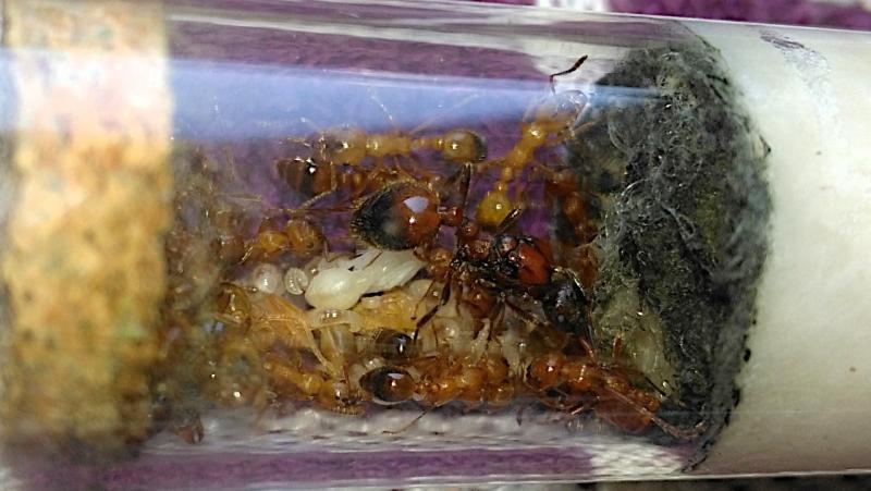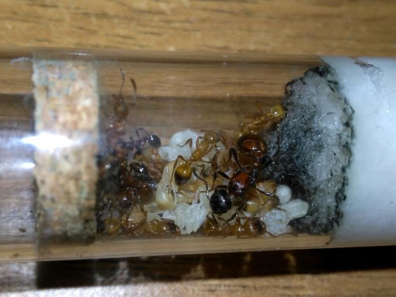 Manica rubida dostały formikarium i od razu rzuciły się....  na wodę. Chyba zbyt mocno upchałem watę w probówce.