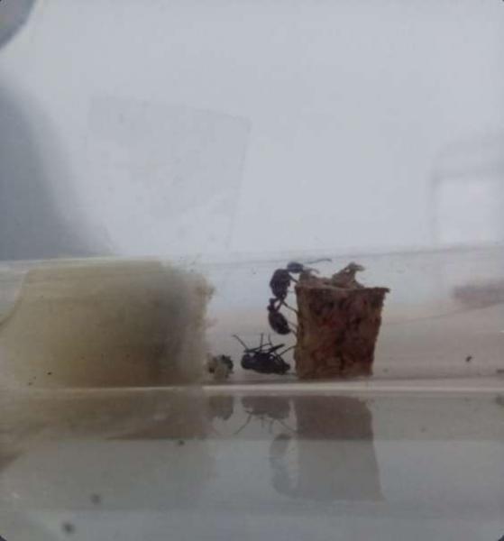 No i tak leciały miesiące ,a ja na na forum zobaczyłem że gatunek się roi. Wtedy poczułem, że to ten czas. Kupiłem pierwszą, przyszła martwa, więc postanowiłem że kupię drugą tym razem przez dc. Ta królowa pochodzi od użytkownika mitz. Chciałem dać kilka informacji o tym, gdzie została złapana ale poprzedni właściciel kupił kilka Q w raz z tą, którą ja mam. Paczke otworzyłem po kilku godzinach po tym jak dotarła( w tedy nie było mnie w domu). Tym razem paczka była solidnie zapakowana. Ten niepokój pamiętam do dziś. Żyje! - wykrzyczałem z radości. No ale teraz konkretnie. Królowa dotarła do mnie 15.06.2022. Kilka jaj, kilka mikro larw porozrzucanych po probówce streściło mi komfort podróży. Po 3 próbach wyjścia z probówki na arenę udało się. Kilka prób i doszła do miodu, była trochę wygłodniała(ale to oczywiście jej nie przeszkodziło w ugryzieniu mnie). Oszczędzę wam oglądanie pierwszej fotki ze względu na jej jakość. Tu fotka(20.06.2022):