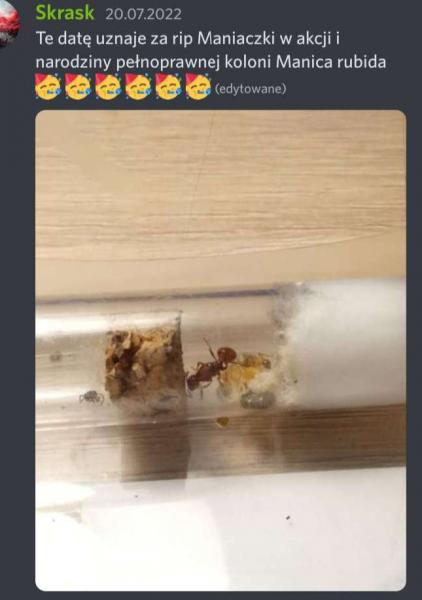 Głupio wierzyłem że maniaczka w akcji będzie już tylko znosiła jaja, było na odwrót, niż się spodziewałem - robotnica siedziała w gnieździe, a matka patrolowała na arenie. Ostatecznie skończyło się to przy 20 robotnicach, chociaż dzisiaj kiedy podałem białko chciała wyjść, wyrodne córki zaciągneły ją do komory lęgowej. Tu zatrzymujemy się przy końcówce lipca. Dalszą część dziennika dokończę pisać w innym terminie.